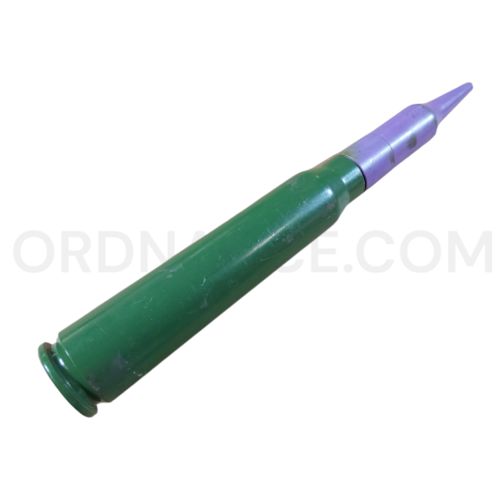 Inert 25mm Swiss armor-piercing discarding-sabot dummy/drill round used in the 25mm Oerlikon KBB. This 25x172mm shell casing is made of steel and is in good condition. The 25mm Oerlikon KBB was an autocannon developed by Switzerland in 1974 and entered into service in 1986. It is a gas-operated autocannon with a double feed mechanism and multi-slotted muzzle brake.